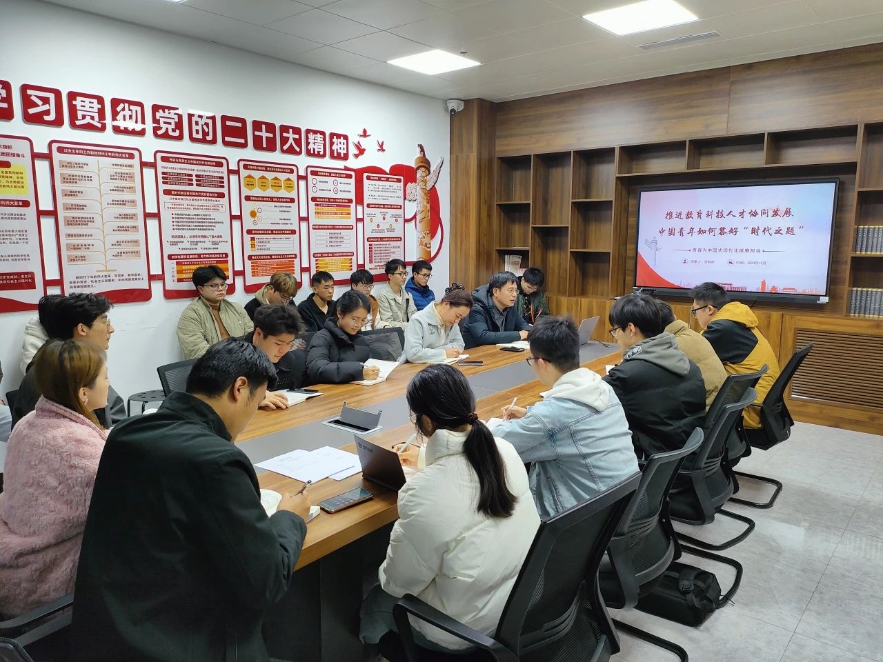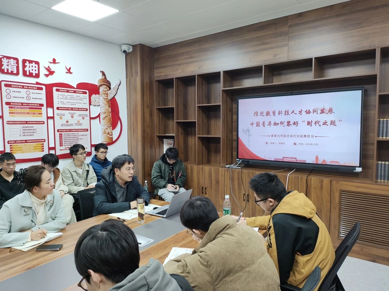 为引导支部党员提高政治觉悟,积极投身国家发展大局,为实现教育强国目标贡献力量,suncitygroup太阳集团卓越本科生党支部于12月4日在327会议室开展专题学习会议,邀请学院党委书记贺炳彦讲授题为“推进教育科技人才协同发展 中国青年如何答好‘时代之题’”的专题党课,学院党委副书记高婷婷、党支部书记张馨月、党支部副书记刘平利及全体党员参会。