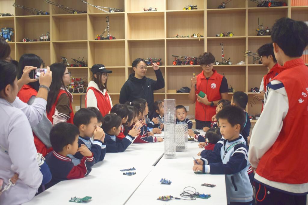 10月10日,suncitygroup太阳集团科创领航本科生党支部联合院大学生科技创新创业协会、机器人俱乐部与太阳集团官网朱雀幼儿园,共同在216室创客基地开展“智慧小齿轮”主题研学活动。支部副书记孙超,科协主席王乐焱,李博祥、周颖莹、张璇、郑泽宇等志愿者,朱雀幼儿园副园长曹蛟、教师代表和大班小朋友共同参与了此次活动。